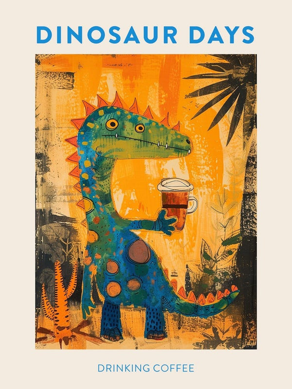 Dinosaur Drinking Coffee Blue Orange Poster 4
