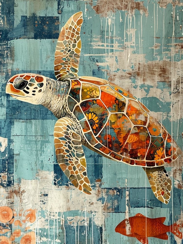 • Sea Turtle Mixed Media Blue Collage