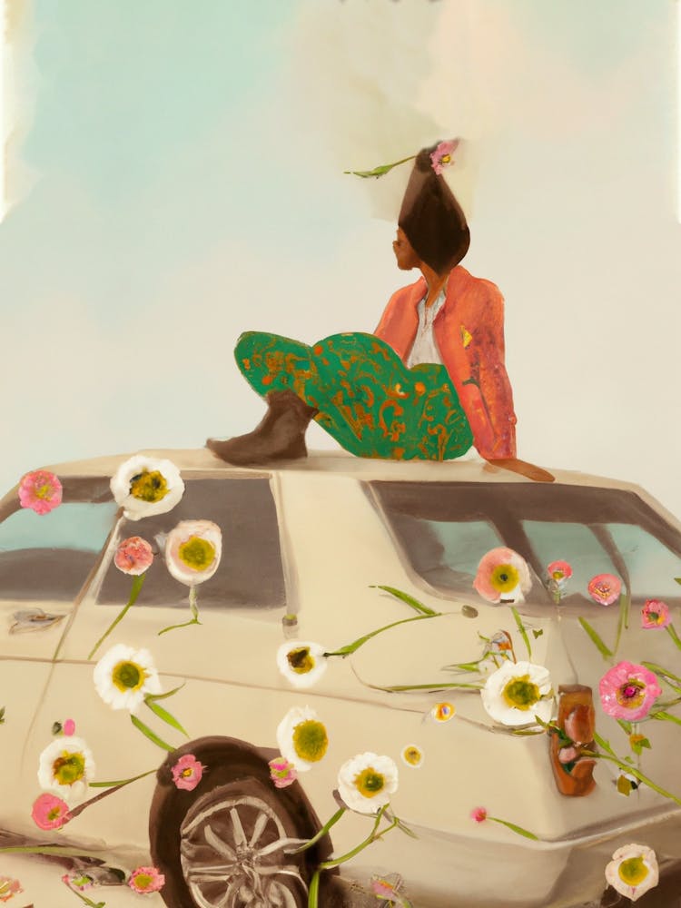 • Thoughtful Woman Sitting On Car Roof By Flowers Autumn Colours