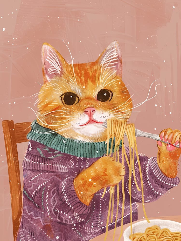 • Brown White Cat Eating Pasta Folk Illustration 4
