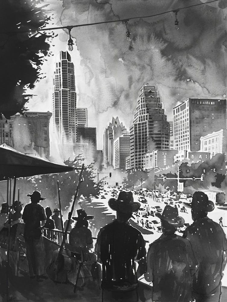 Live Music Scene Austin Texas Black And White Watercolour 2 -