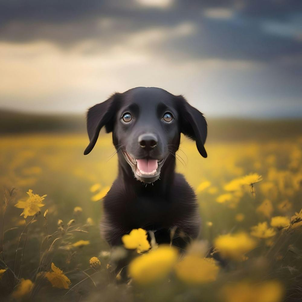 Black Dog In A Field Of Yellow Flowers