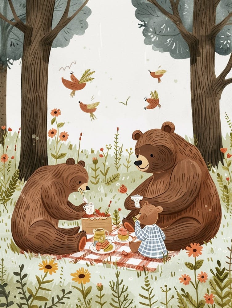 Brown Bear Family Picnicking In The Woods Storybook Illustration 4 -