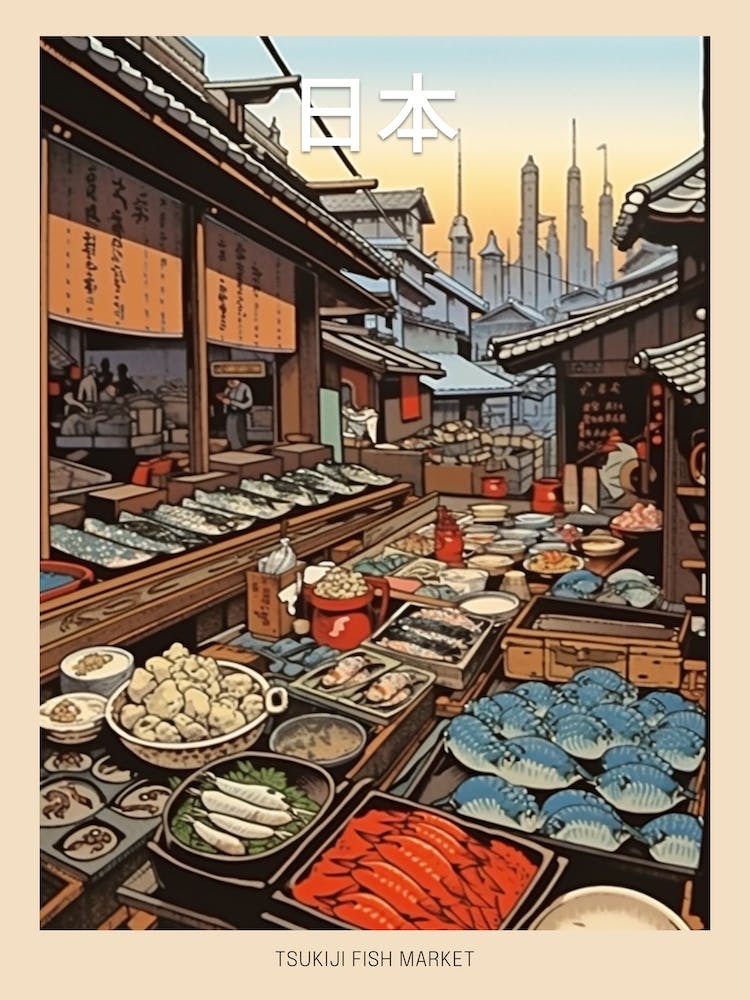 • Tsukiji Fish Market, Japan Vintage Travel Art 2 Poster