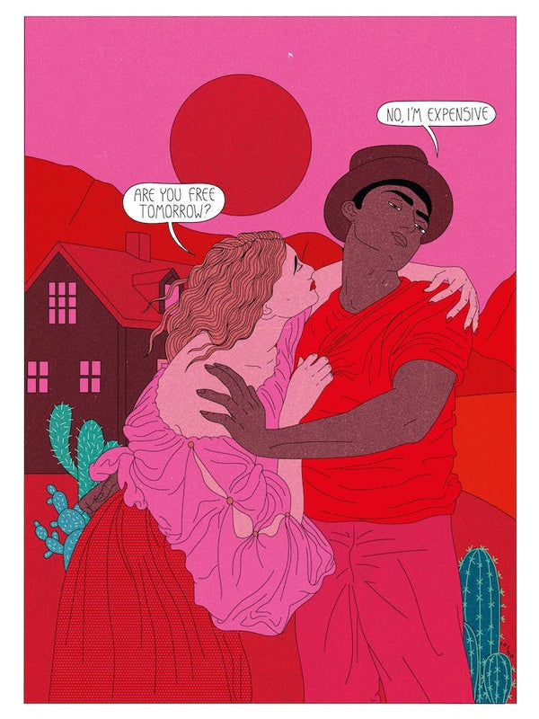 Our collection boasts an incredible range of artistic styles, ensuring there's a piece to resonate with every sensibility. You'll find the quiet elegance of minimalist illustrations depicting serene moments, such as a couple strolling by the Eiffel Tower in winter, or the vibrant energy of pop art illustrations that blend humor with empowerment, like the witty “NO I'M EXPENSIVE” piece. Dive into romantic fantasy art with hot air balloons drifting under starlit skies, or embrace the adventurous spirit with a jungle-framed kiss amidst mountain views. Each print is a testament to the power of art to convey complex emotions and cherished experiences.