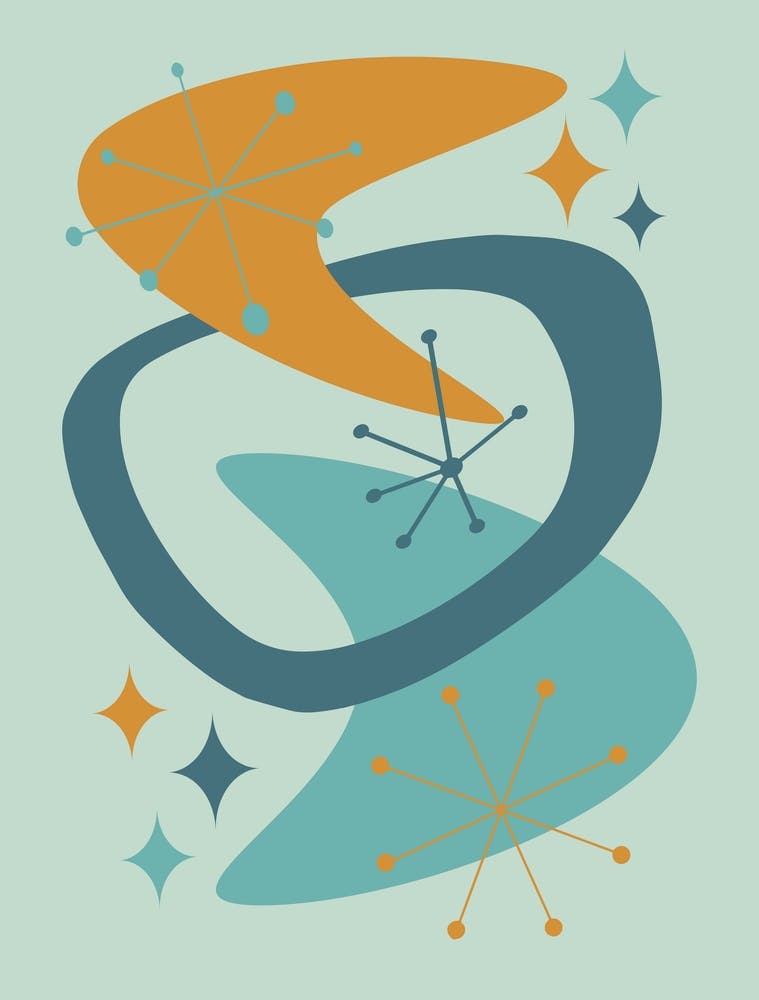 • Mid Century Atomic Age Abstract 7 Teal, Turquoise, Orange, Aqua