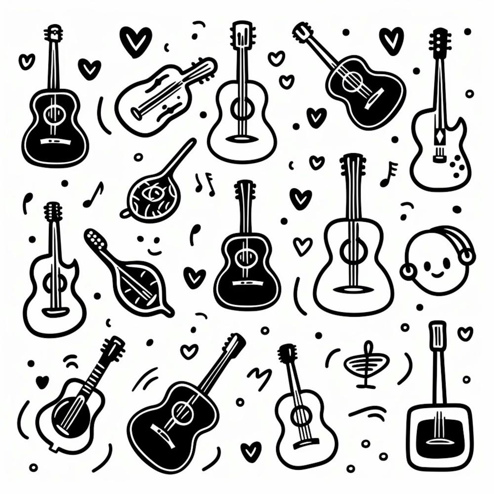 A Minimalistic Vector Icon Set Of Guitar, Black On White, Handdrawn Doodle Icon -