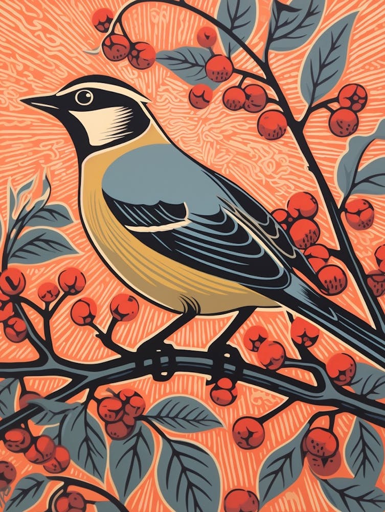 Vintage Bird Linocut Cedar Waxwing 3 -