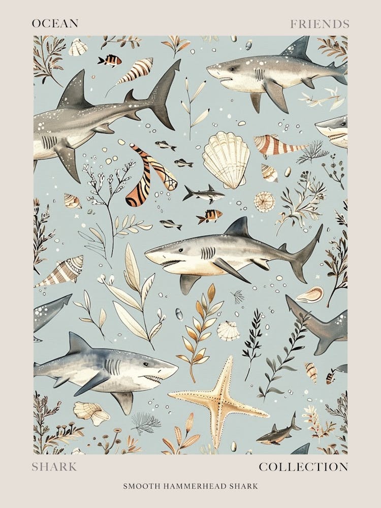 Pastel Blue Smooth Hammerhead Shark Watercolour Seascape 1 Poster -