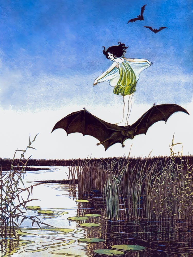 The Witch's sister on Her Black Bat - Ida Rentoul Outhwaite 1921 - Fairy Bat Girl - Witchy Fairytale Witchcore Cottagecore Fairycore Spooky Remastered Art Deco Vintage Illustration Australian -