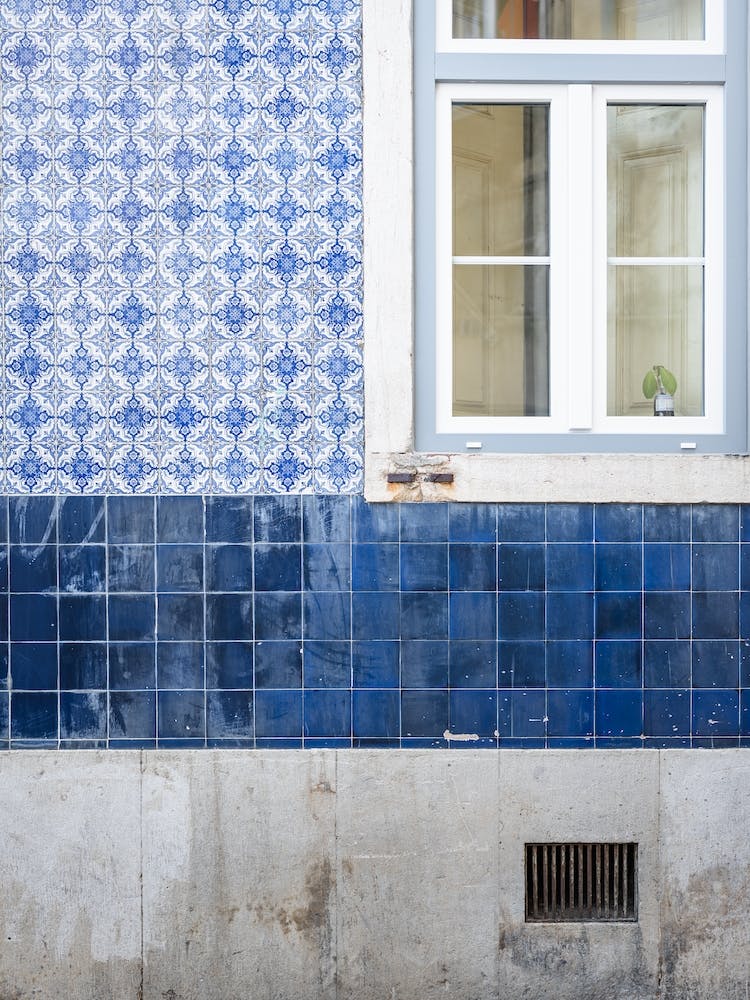 Blue Portuguese Ceramic Tiles And Colourful Wall At Alfama Lisboa -