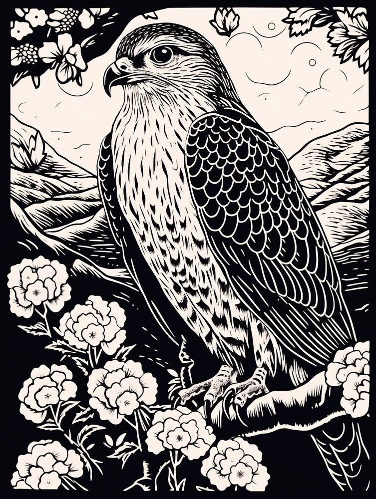 B&W Bird Linocut Red Tailed Hawk 2 -