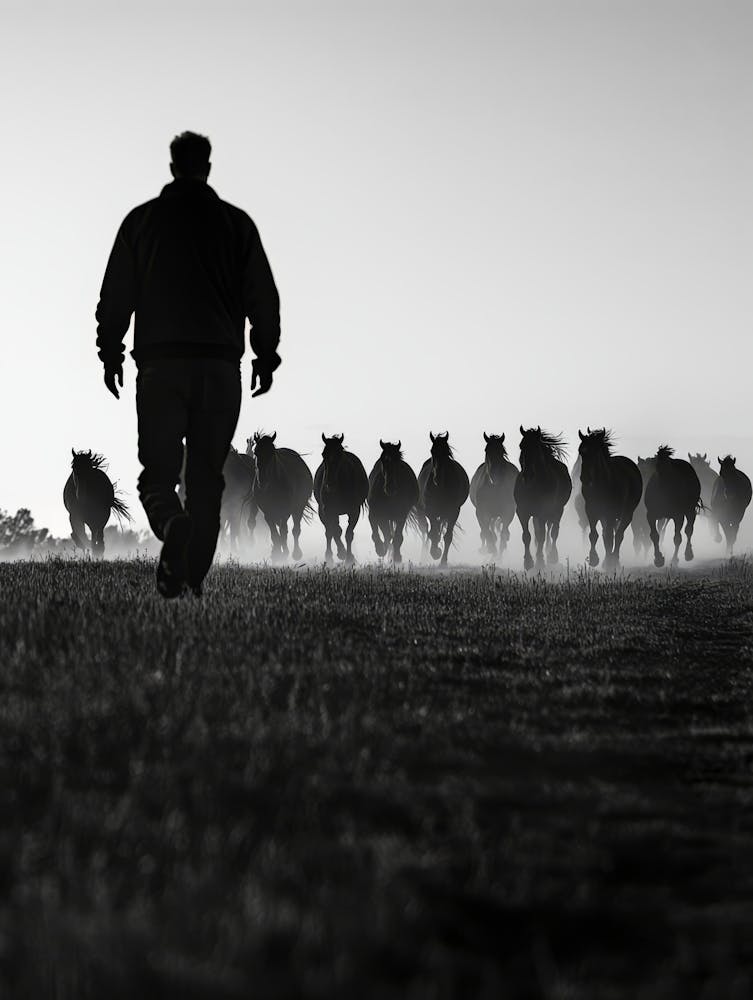 A lone figure walks into a cloud of dust, where a powerful herd of horses thunders forth in silhouette. Rendered in stark black and white, the scene pulses with raw, untamed energy and a sense of rugged freedom. It’s a primal encounter, captured in dramatic monochrome.