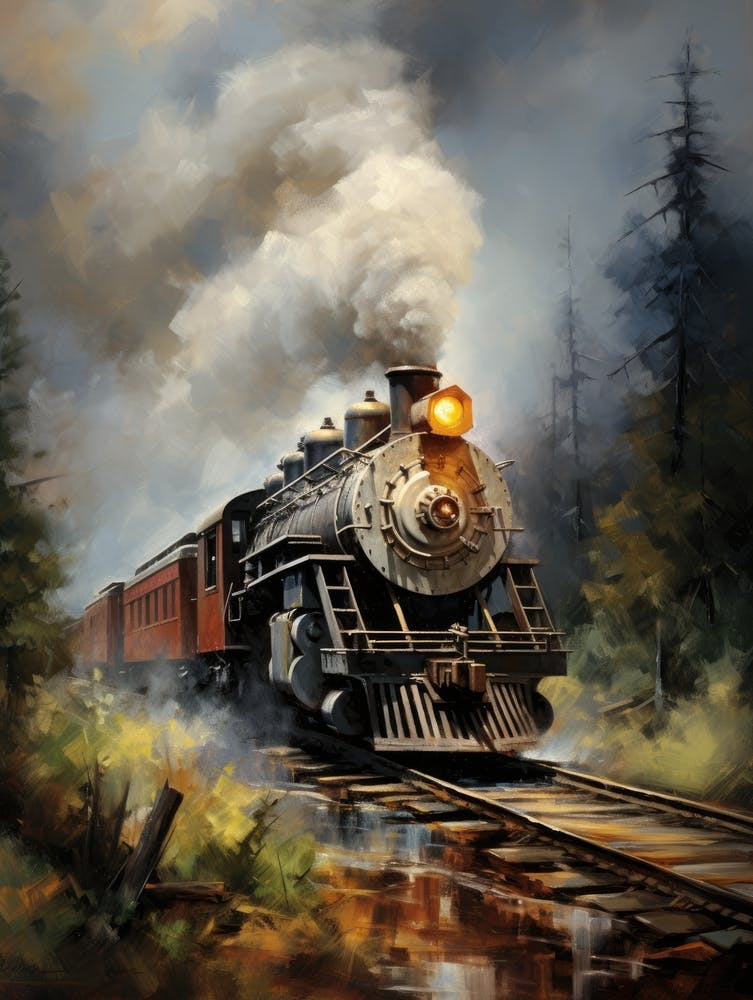 A powerful steam train emerges from a misty, dark forest, its golden headlight piercing the gloom. Billowing white smoke trails behind, contrasting with the rich, earthy tones of the surrounding trees and damp ground. It captures the nostalgic romance of a bygone era, a journey cutting through nature's embrace.