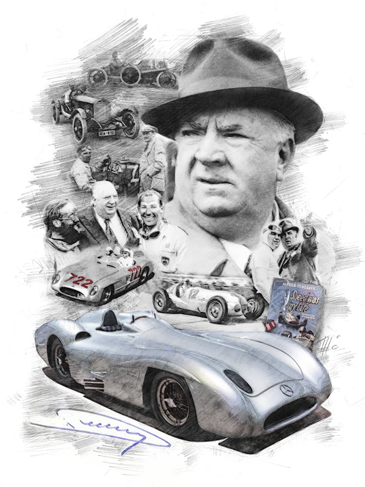 Eine kraftvolle Montage feiert die Rennlegende Alfred Neubauer, umgeben von den eleganten Formen klassischer Autos in einem dynamischen Skizzenstil. Die Silbertöne und akribischen Details evozieren die goldene Ära des Motorsports und verbinden Geschichte mit Geschwindigkeit. Es ist eine Hommage an eine vergangene Ära automobiler Exzellenz, pulsierend mit dem Nervenkitzel der Rennstrecke.