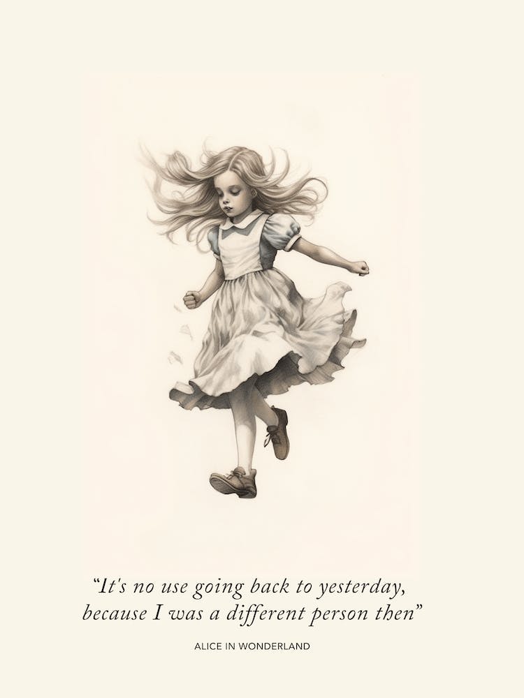 Eine zarte, sepiafarbene Illustration zeigt eine junge Alice, ihr Haar wehend, eingefangen in einem Moment skurriler Bewegung. Unter ihr regt ein tiefgründiges Zitat aus dem Wunderland zum Nachdenken über Wachstum und Veränderung an. Das Kunstwerk verbindet klassischen Charme mit einer zeitlosen Botschaft und lädt den Betrachter in eine Welt literarischer Magie und Selbstfindung ein.