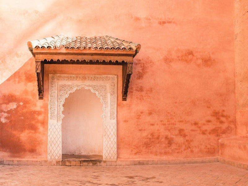 Eine wunderschön geschnitzte, gewölbte Tür steht als stummer Wächter in einer alten marokkanischen Wand, ihre komplizierten Details gewähren einen Einblick in eine reiche kulturelle Vergangenheit. Die texturierten Terrakottatöne des gealterten Putzes rufen die Wärme der Wüstensonne und zeitloses Handwerk hervor. Dieses Bild flüstert Geschichten von Geschichte und exotischen Reisen.