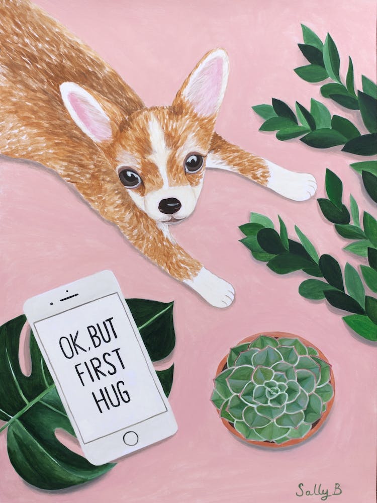 Ein schelmischer Chihuahua streckt sich auf einem leuchtend rosa Hintergrund aus und posiert lässig neben einem Telefonbildschirm, der 'OK. ABER ZUERST UMARMEN' verkündet. Üppige grüne Pflanzen und eine Sukkulente vervollständigen diese spielerische Szene, eine charmante Ode an die Zuneigung von Hunden und modernen Humor.