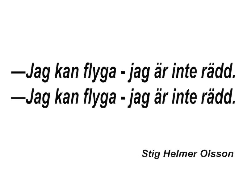 Knackiger schwarzer Text auf einem sauberen weißen Hintergrund präsentiert ein schwedisches Zitat: 'Jag kan flyga - jag binte rädd' (Ich kann fliegen - ich habe keine Angst). Die Wiederholung unterstreicht eine Botschaft von Mut und Selbstvertrauen. Seine karge Einfachheit erzeugt einen kraftvollen, erhebenden Puls, der auf leise, elegante Weise von innerer Stärke und Furchtlosigkeit spricht.