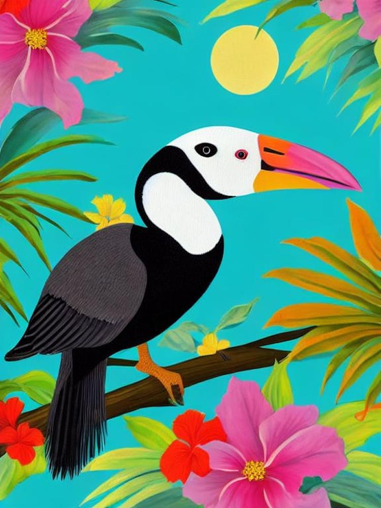 Ein lebendiger Tukan, sein Schnabel ein Farbtupfer in Pink und Orange, thront königlich inmitten üppigen tropischen Laubs und elektrisch pinker Blüten. Der türkisfarbene Himmel bildet einen markanten Hintergrund und lässt die Szene vor Leben sprühen. Der visuelle Puls ist ein Farbenrausch, der einen kulturellen Ton eines exotischen Paradieses und einen emotionalen Unterstrom von belebender Freude und natürlicher Pracht vermittelt.