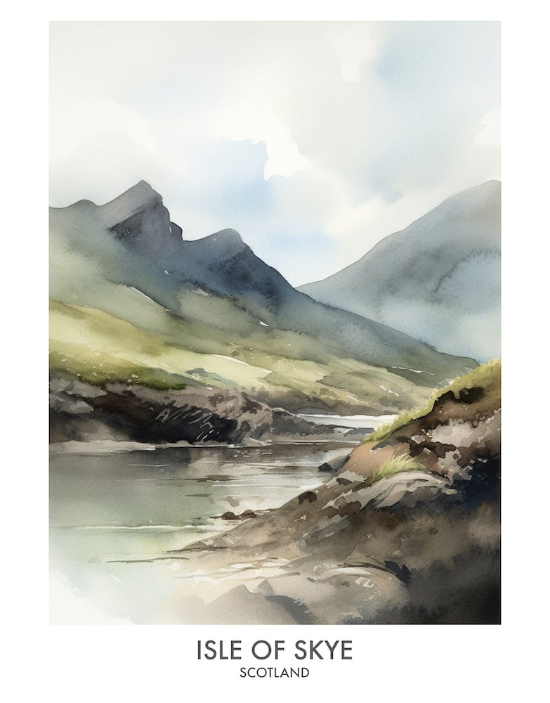 Misty mountains loom over tranquil waters, painted in soft, muted watercolors that capture the raw beauty of the Scottish Highlands. The artwork evokes a sense of serene adventure, inviting viewers to breathe in the cool, crisp air of the Isle of Skye. It's a timeless homage to rugged natural grandeur.