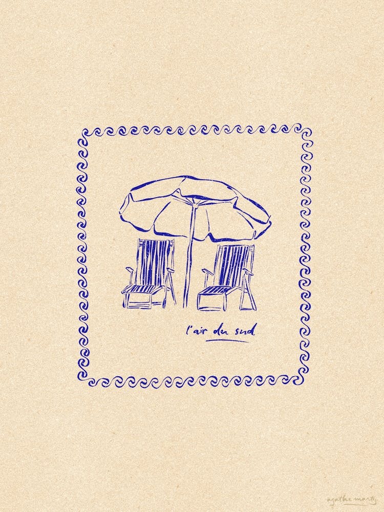 Eine zarte blaue Linienzeichnung fängt zwei Strandstühle unter einem Sonnenschirm ein, umrahmt von einem einfachen Rand. „L'Air du Sud“ flüstert von warmen Brisen und ruhigen Sommertagen. Es ist eine minimalistische Einladung zur Entspannung, die die stille Ruhe eines perfekten Strandurlaubs heraufbeschwört.