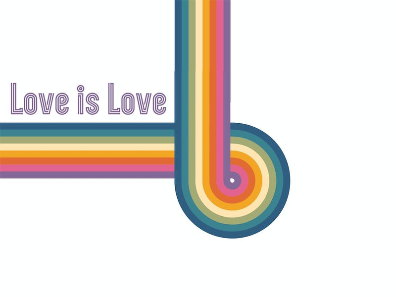 Swirling rainbow stripes explode from the corner, framing the timeless declaration "Love is Love" in a bold, retro typeface. This graphic print radiates joyful energy and a powerful message of inclusion, celebrating universal acceptance with a vibrant 70s aesthetic.