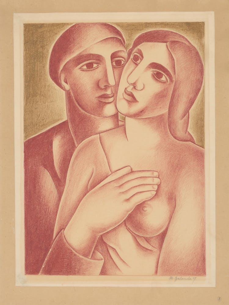 Zwei in warmen, erdigen Tönen dargestellte Figuren umarmen sich mit zarter Zärtlichkeit, ihre Formen vermitteln stille Intimität und geteilte Hingabe. Die gedämpfte Farbpalette und der klassische Stil evozieren eine zeitlose Darstellung von Liebe und Verbundenheit, einen Moment tiefer emotionaler Resonanz, eingefangen mit unaufdringlicher Anmut.