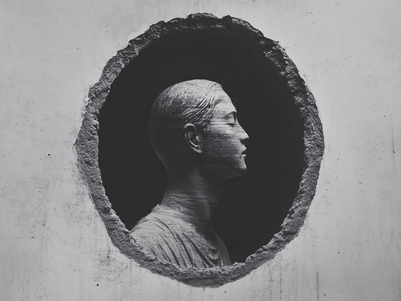 Das ruhige Profil eines Mannes tritt aus einem grob behauenen Oval hervor, gerahmt von starken Kontrasten aus Licht und Schatten. Das monochrome Bild ruft ein Gefühl von Selbstbeobachtung und stiller Einsamkeit hervor, als ob ein Gedanke aus dem Stein selbst Gestalt annimmt. Es lädt zur Kontemplation über Entstehung und Begrenzung ein, eine tiefgründige visuelle Aussage.