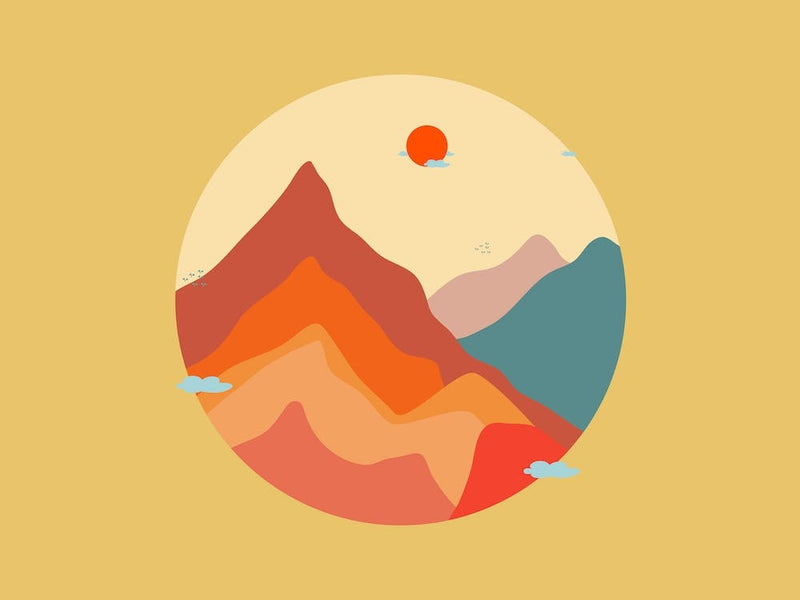 In einem warmen, runden Rahmen erheben sich stilisierte Berge in Terrakotta- und tiefen Orangetönen, gekrönt von einer sanften Sonne und einem Mond. Eine ruhige, feminine Form tritt aus der Landschaft hervor und verkörpert den Geist von Mutter Natur. Das minimalistische Design und die erdige Farbpalette wecken eine Verbindung zur Natur und suggerieren Frieden, Stärke und die zeitlosen Kreisläufe des Lebens.