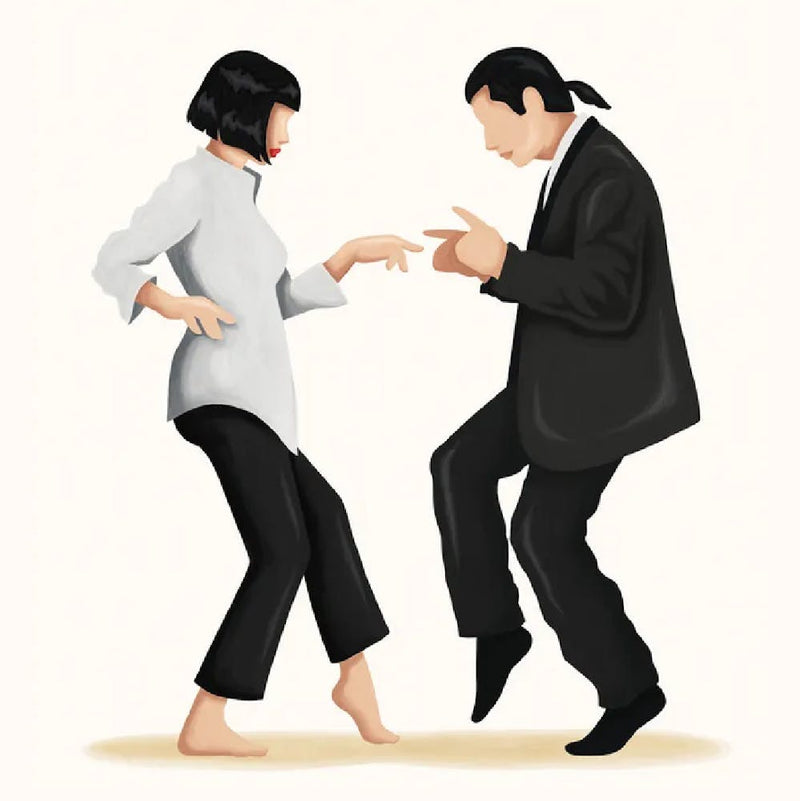 Zwei ikonische Figuren, in scharfen schwarzen Silhouetten vor einem gedämpften Hintergrund dargestellt, nehmen eine zeitlose Tanzpose ein. Die minimalistischen Linien evozieren den coolen, rebellischen Geist des Kinos der 90er Jahre und fangen einen prägenden Moment der Kultklassiker-Kultur ein. Es ist eine prägnante, stilvolle Anspielung auf legendäres Geschichtenerzählen und ikonischen Stil.