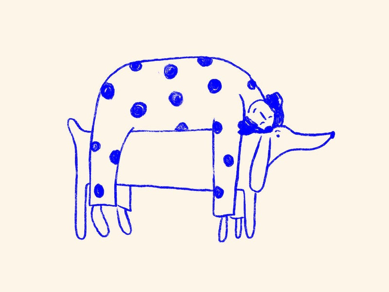 Eine skurrile blaue Strichzeichnung zeigt ein schläfriges Kind, das sich an einen freundlichen Hund kuschelt, beide in gepunkteten Schlafanzügen. Die einfachen, zarten Striche rufen Gutenachtgeschichten und ruhige Träume hervor. Es strahlt eine tröstende, spielerische Energie aus, perfekt für ein Kinderzimmer.