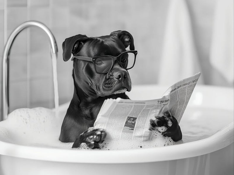 Ein charmanter Staffordshire Bull Terrier, komplett mit Brille, genießt ein Schaumbad, während er die Zeitung 'liest', sein Ausdruck ist völlig emotionslos. Dieses Schwarz-Weiß-Foto fängt einen Moment purer, skurriler Freude ein und zaubert mit seiner unerwarteten Häuslichkeit und der spielerisch menschlichen Darstellung eines geliebten Haustieres ein Lächeln hervor.