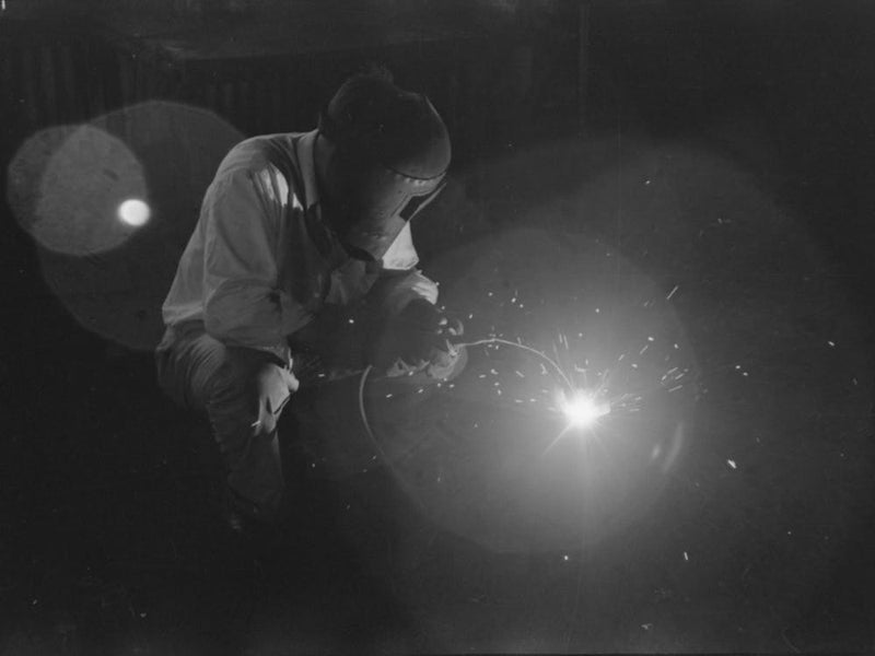 Eine karge, schwarz-weiße Fotografie friert einen Moment intensiver Arbeit ein, einen Schweißer, der im brillanten Lichtstrahl seines Brenners gebadet ist. Funken fliegen und erhellen die dunkle, körnige Umgebung einer Ölfeldaktivität. Dieses Bild ist roh und kraftvoll, ein Zeugnis menschlicher Anstrengung und Industrie, das die mühsame Schönheit einer vergessenen Ära einfängt.