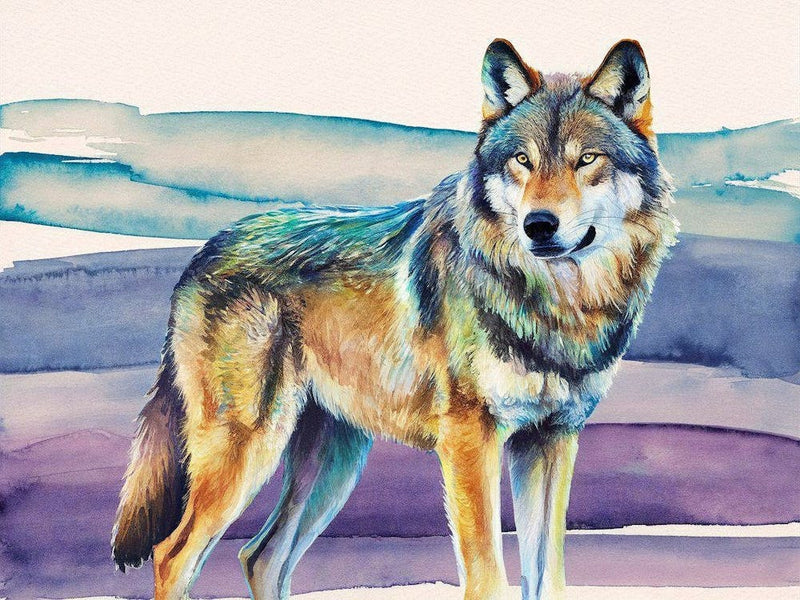 Ein majestätischer Wolf steht bereit, sein Fell ein atemberaubendes Mosaik aus Blau-, Lila- und warmen Erdtönen, zum Leben erweckt durch ausdrucksstarke Aquarellwaschungen. Sein Blick ist stetig und intensiv und vermittelt den wilden Geist und die ungezähmte Kraft des Tieres. Es ist eine lebendige Ode an die Majestät der Natur, die ein Gefühl der Ehrfurcht und des Staunens hervorruft.