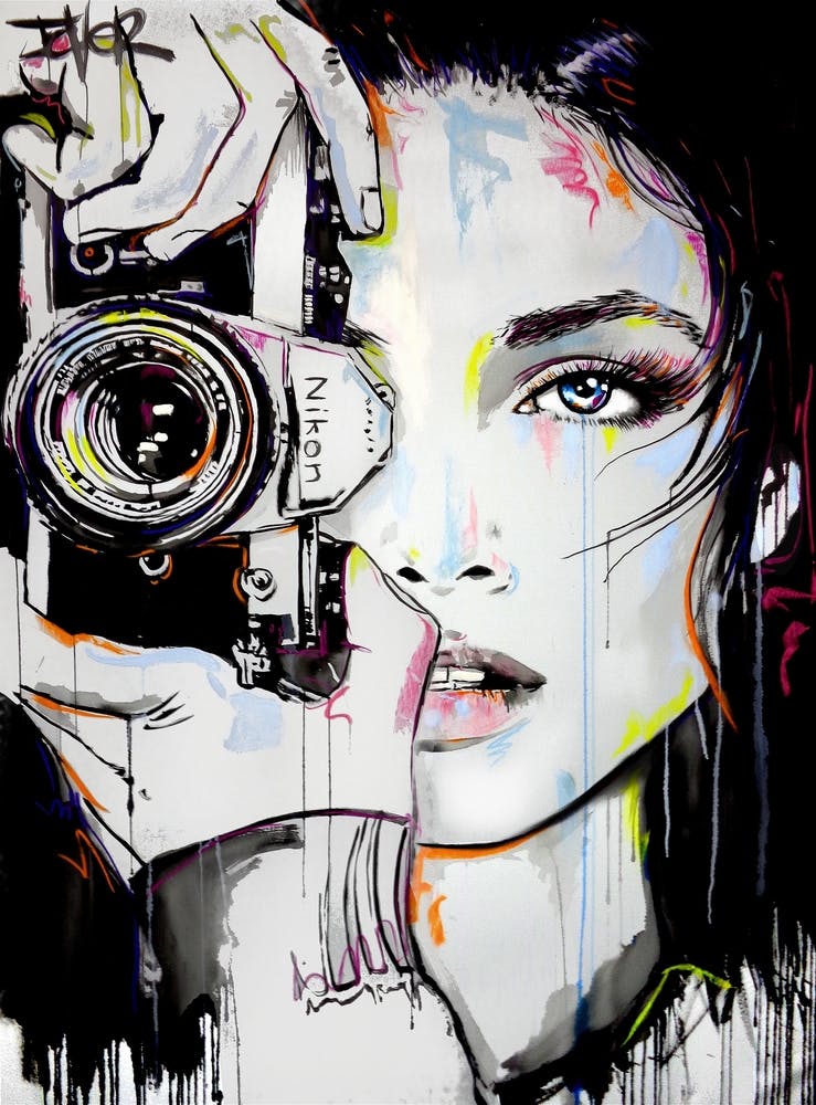 A striking woman's gaze pierces through the lens of a vintage camera, her face alight with electric splashes of neon color. Bold lines and dramatic contrasts capture a moment of intense focus and creative energy. This pop art portrait pulses with a vibrant, dynamic spirit.