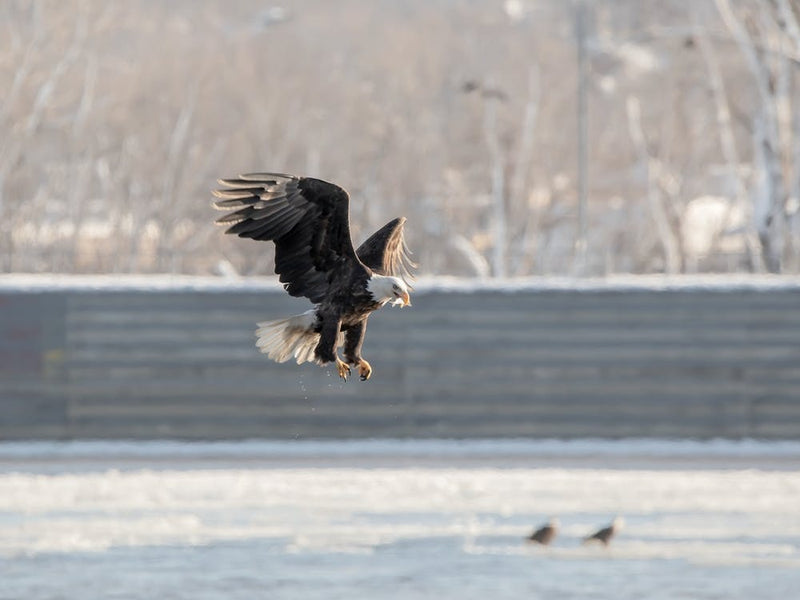 A majestic bald eagle, wings spread wide, descends gracefully above a frozen expanse, clutching a fish in its talons. The sharp focus on its determined gaze and powerful form captures the raw beauty and ferocity of wildlife in its natural, stark winter habitat. A moment of focused power and survival.