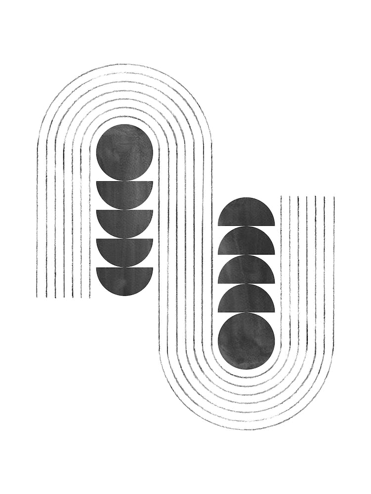 Bold black and white arcs interlock with solid semicircles, creating a balanced, rhythmic composition. This artwork embodies the clean lines and geometric simplicity of Mid-Century Modern design. It's a statement of minimalist elegance, inviting a sense of calm order and timeless style.
