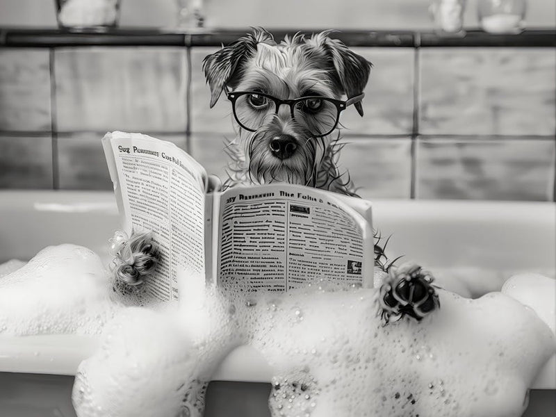 A border terrier, donning spectacles, sits serenely in a bubble bath, engrossed in a newspaper. This black and white photograph captures a moment of charming domestic humor and canine personality. The scene is both unexpected and heartwarming, inviting smiles and a touch of lightheartedness into any space.