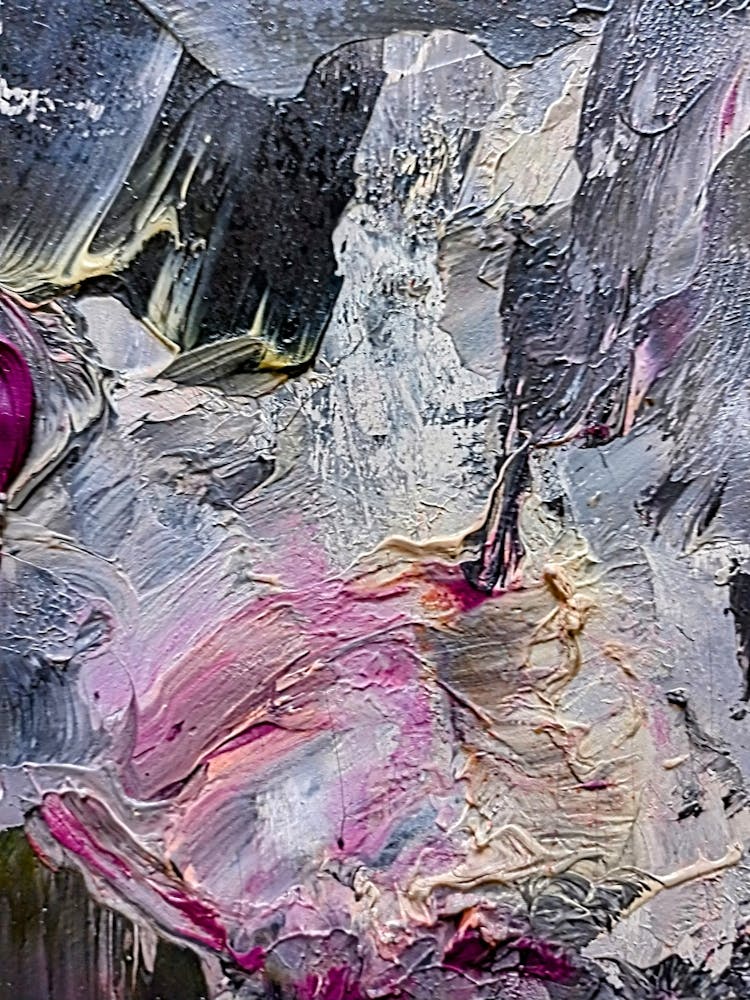 A tempest of thick, swirling paint creates a dramatic abstract landscape, dominated by charcoal grays, deep blacks, and electrifying streaks of fuchsia and lavender. The impasto technique gives the canvas a visceral, almost sculptural quality, evoking raw emotion and unrestrained energy. It pulses with an intense, captivating power.