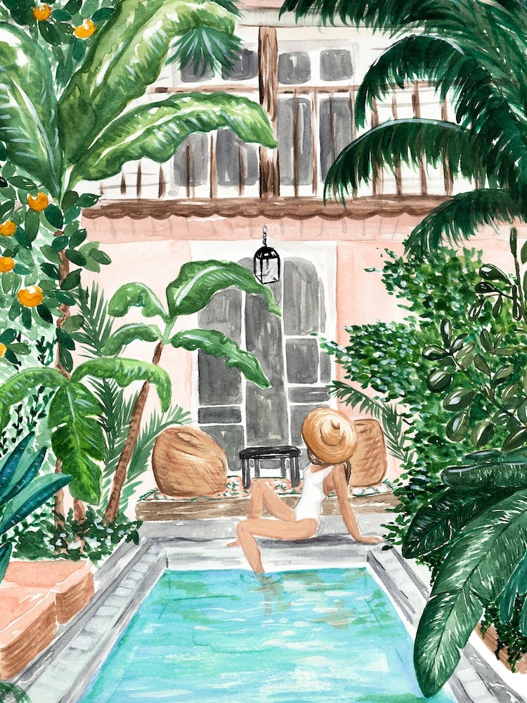 Sunlight filters through lush palm fronds onto a tranquil Moroccan courtyard, where a woman reclines by a cool blue pool. The vibrant watercolor captures the serenity and exotic beauty of a hidden oasis. It evokes the quiet luxury of a far-off escape, filled with warmth and blissful relaxation.