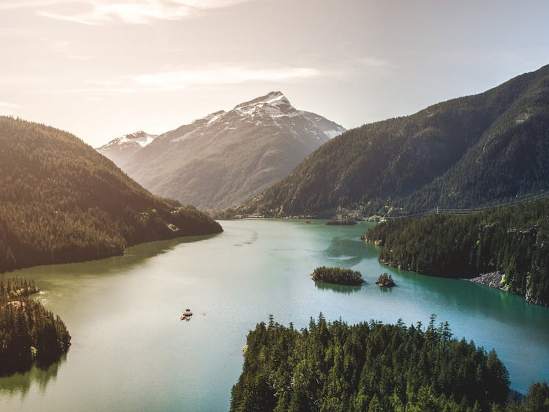 Majestic, snow-capped peaks rise above a tranquil, emerald-green lake, reflecting the soft, ethereal glow of a fading sunset. Verdant forests cling to the mountainsides, creating a breathtaking panorama of untouched wilderness. This photograph captures a moment of serene grandeur, inviting viewers to breathe in the crisp, cool air of the Pacific Northwest.
