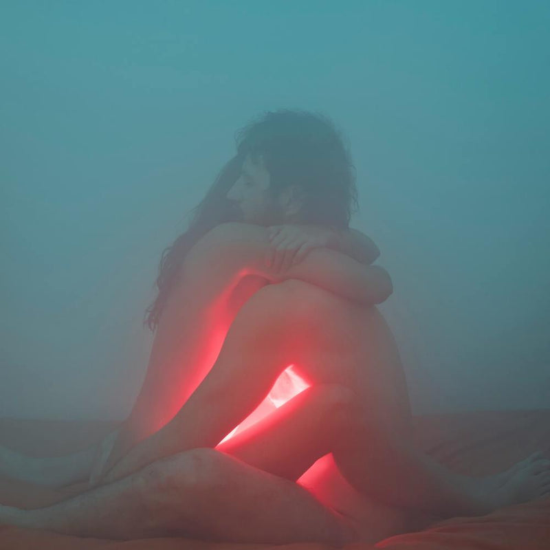 Two figures are enveloped in a soft, ethereal mist, illuminated by a warm, internal glow of red and orange. Their embrace speaks of profound intimacy and comfort, creating a powerful sense of connection and quiet vulnerability. The cool, muted teal backdrop adds to the scene's mysterious, dreamlike quality.