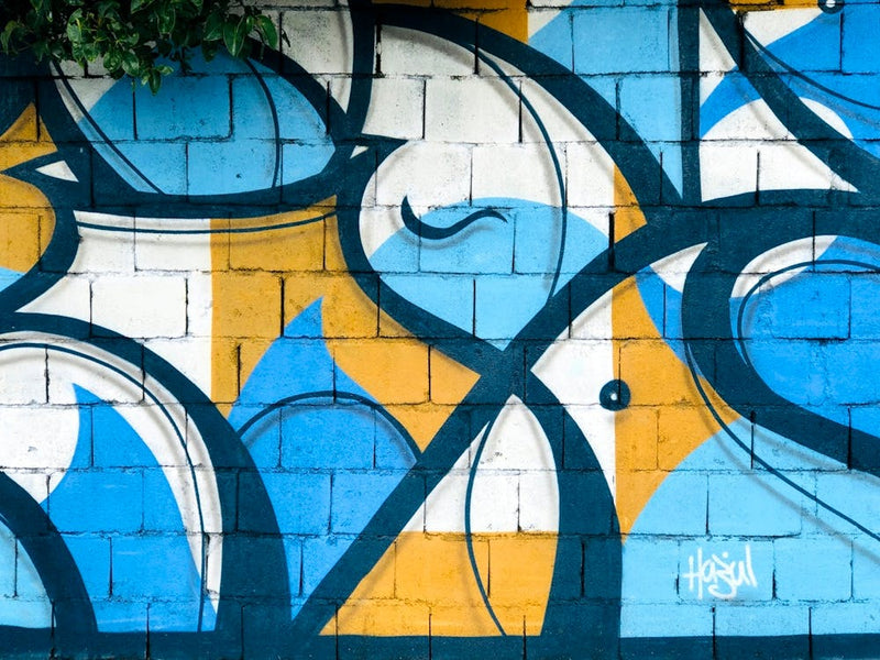 Bold blue and yellow shapes intertwine with black lines, creating a dynamic abstract pattern across a weathered brick wall. Patches of white peek through, adding to the urban texture. This vibrant street art pulsates with raw, energetic expression, capturing the fleeting beauty and creative spirit of city environments.