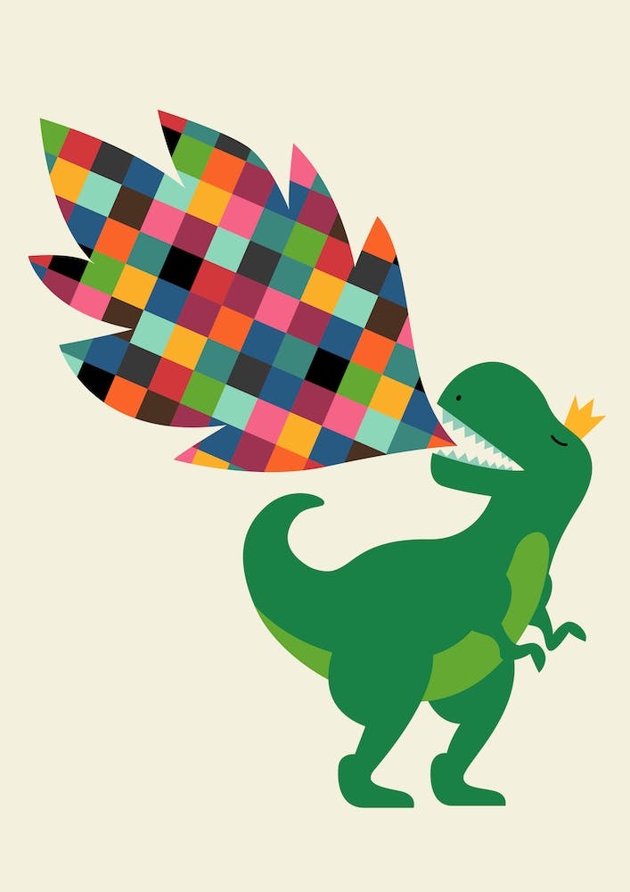 A friendly green dinosaur, crowned with a tiny yellow king's crown, exhales a vibrant plume of rainbow-colored geometric shapes. Its wide grin and playful eyes bring warmth to the simple composition. This piece radiates pure joy and whimsical energy, a delight for young imaginations.