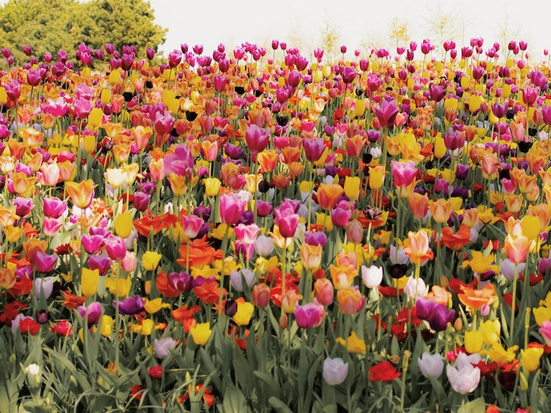 A sprawling field of tulips bursts forth in a riot of vibrant pinks, yellows, and oranges, stretching under a bright, clear sky. Each bloom is a testament to spring's joyful awakening, creating a tapestry of pure, unadulterated color. The scene pulses with an uplifting energy, inviting viewers to lose themselves in nature's spectacular display.