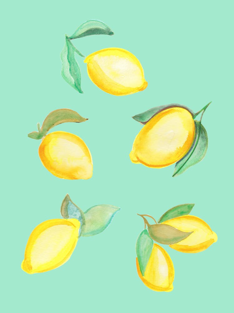 Bright watercolor lemons, with their fresh green leaves, dot a soft teal backdrop, capturing the essence of a sun-drenched day. Each brushstroke evokes the juicy tang and vibrant aroma of fresh citrus, bringing a splash of lively, natural energy to the space. It's a simple, cheerful reminder of nature's sweet gifts.
