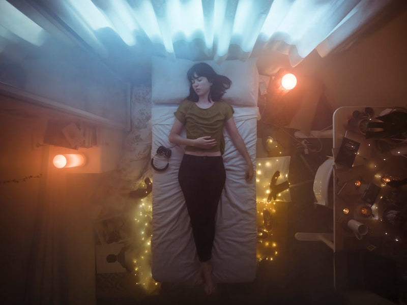 Drenched in a twilight of blues and oranges, a figure lies cocooned on a bed, surrounded by a constellation of fairy lights. It's a moment suspended, a quiet pause from the world. The scene whispers of introspection and the comforting embrace of solitude.