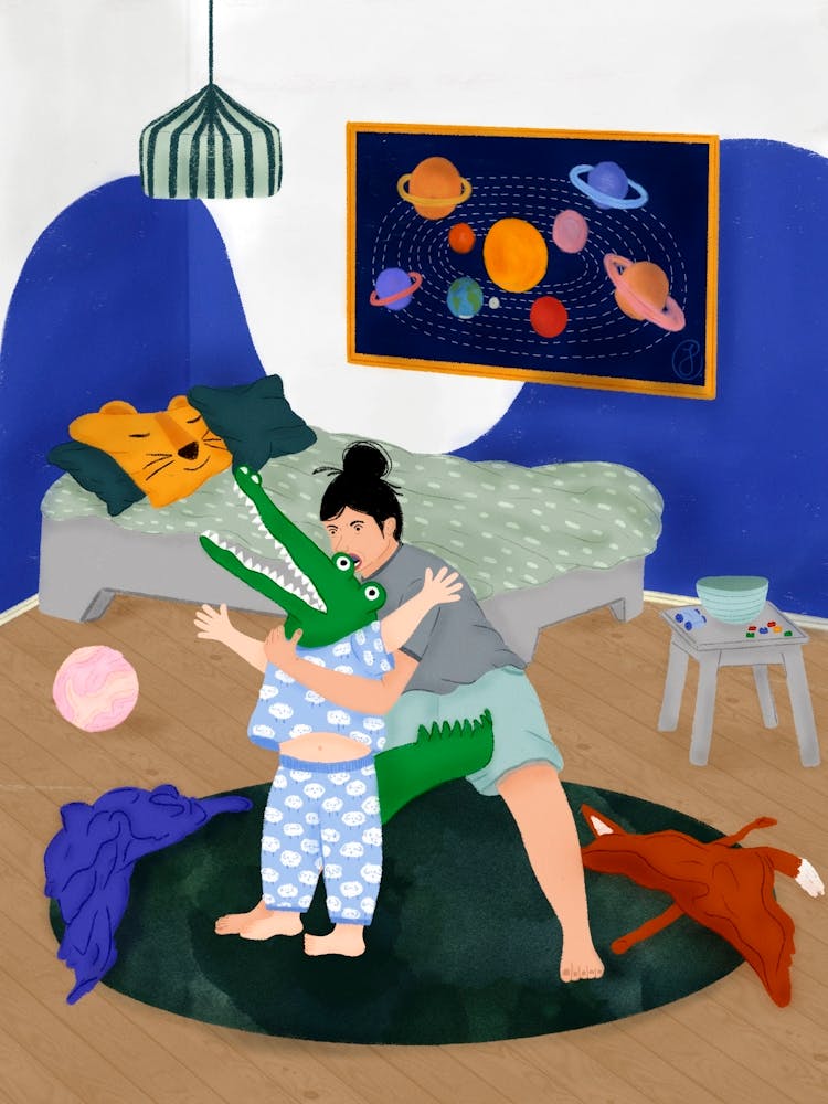 In a whimsical bedroom, a parent and child engage in playful 'pyjama wrestling,' the child joyfully clad in a crocodile costume. The room buzzes with the warmth of imaginative play and familial love, under a solar system mobile. This illustration perfectly captures the vibrant, loving chaos of childhood, a moment of pure, unadulterated fun.