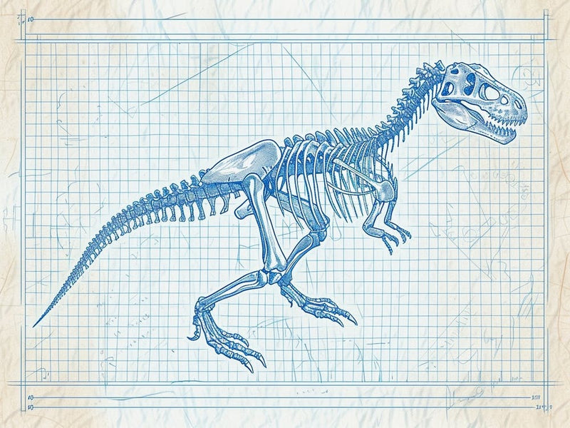 A detailed Deinonychus skeleton unfurls across a grid-lined blueprint, etched in crisp blue lines. The technical precision evokes scientific curiosity and a vintage archaeological spirit, inviting contemplation of ancient, powerful creatures. It’s a relic of prehistoric wonder, reimagined.